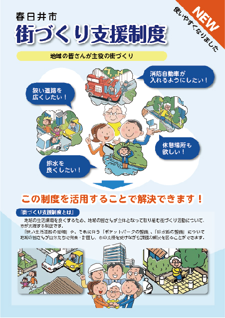 地域の生活環境を良くするため、地域の皆さんが主体となって取り組む街づくり活動について、 市が支援する制度です。「狭い生活道路の拡幅」や、それに伴う「ポケットパークの整備」、 「排水路の整備」について地域の皆さんが自分たちで発案・計画し、市の支援を受けながら課題の解決を図ることができます。
